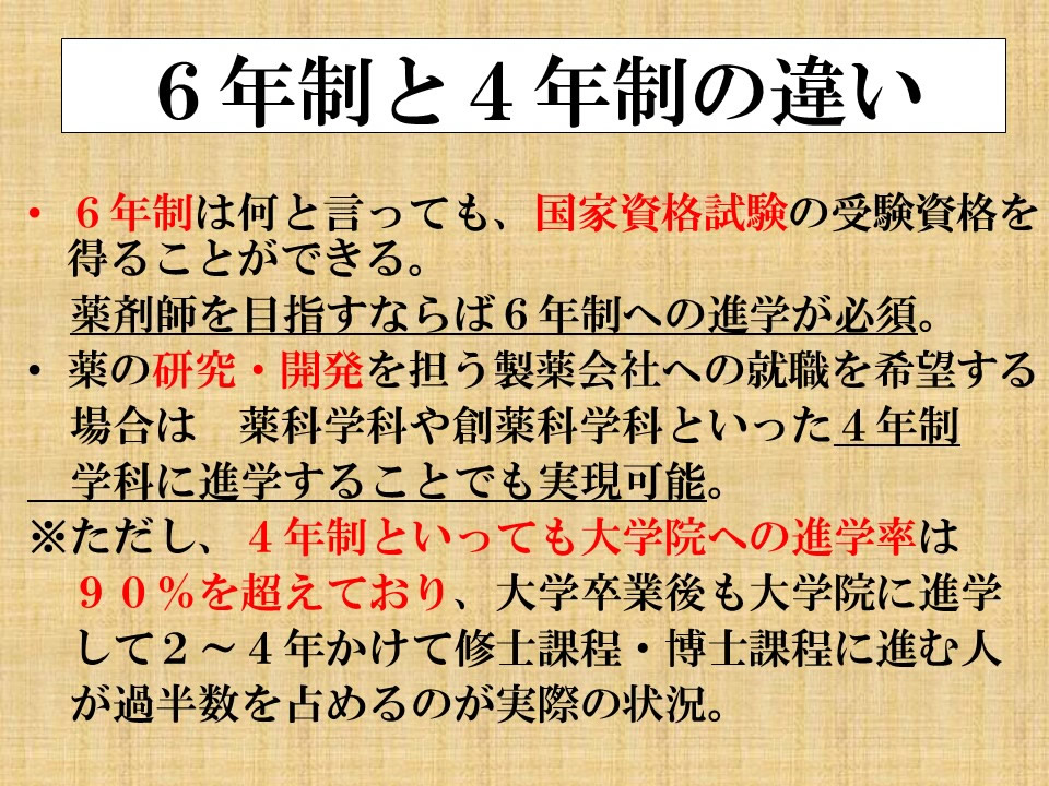 また、受験に関しては各課程を併設している大学では、募集段階で学科が分かれている場合と、入学時点では一括募集を行い、進級時に進路を選択することができる場合があります。大別すると薬剤師となり病院や薬局で働きたいのであれば6年制、薬の研究・開発を行いたいのであれば4年制を目指す選択になるでしょう。